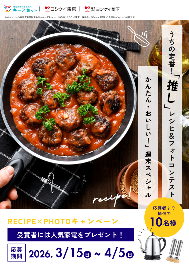 本キャンペーンは、特定非営利活動法人キーアセット、株式会社ヨシケイ東京、株式会社ヨシケイ埼玉、(以下「主催者」)が共同で実施するInstagramキャンペーンです。ご家庭で親しまれている「定番レシピ」をテーマに、料理写真とレシピともにご応募いただくフォトコンテスト形式のキャンペーンです。