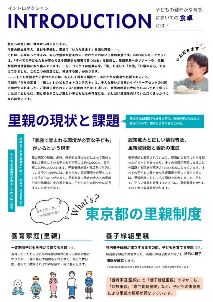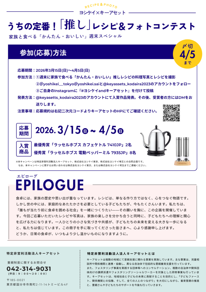 ※本キャンペーンは特定非営利活動法人キーアセット、株式会社ヨシケイ東京、株式会社ヨシケイ埼玉との合同企画です。なお、本キャンペーンに関するお問い合わせは株式会社ヨシケイ東京、または株式会社ヨシケイ埼玉までご連絡ください。東京都の里親制度に関するお問い合わせは特定非営利活動法人キーアセット(042-314-9031)までご連絡ください。