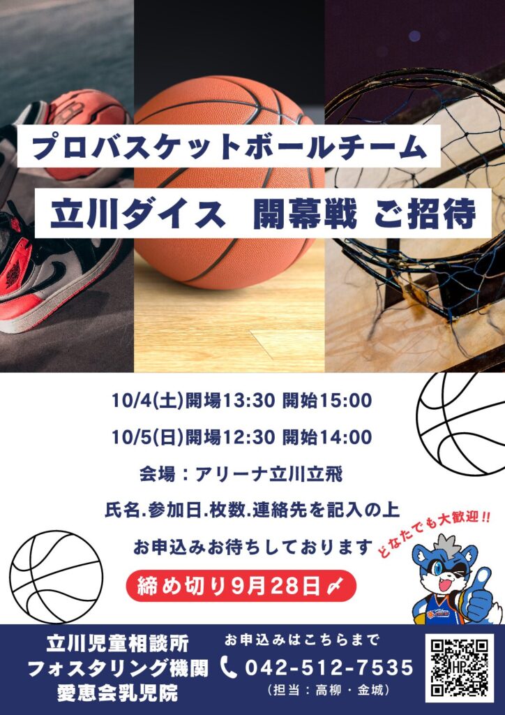 このたび、バスケットボールチーム「立川ダイス」のご厚意により、下記の皆さまを試合にご招待いただけることとなりました。